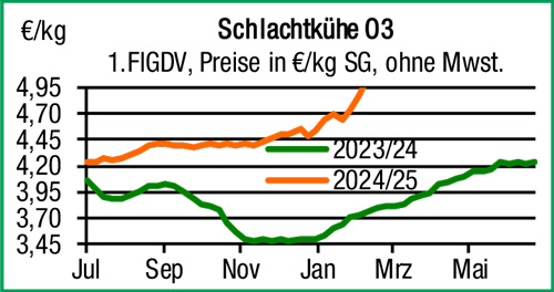 | Nutzkälber | Rekordpreise am Schlachtrindermarkt erhöhen die Einstallbereitschaft in den Mastbetrieben. Das Kälberangebot ist kaum ausreichend, regional verschärft sich die Angebotslage durch den anhaltenden Druck durch die Blauzungenkrankheit. Der Handel meldet fortwährend viele schwache und kranke Kälber. Altersgerecht entwickelte und gut mastfähige Tiere erzielen deutliche Preisaufschläge. |