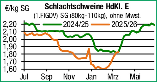 | Schlachtrinder | Die Nachfrage im Metzgereigeschäft gerät zuletzt etwas ins Stocken und vor allem für Jungbullen müssen erste spürbare Preisabschläge hingenommen werden. Weibliche Kategorien hingegen weiter stabil, schwere Schlachtkühe teilweise nochmal fester bewertet. |