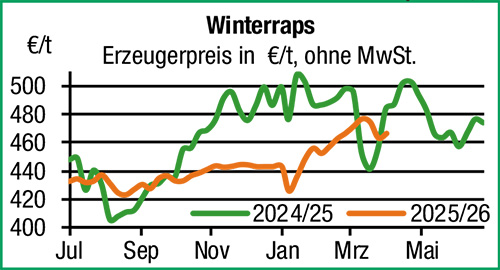| Getreide und Ölsaaten | Die Umsätze am regionalen Getreidemarkt bleiben fortgesetzt schwach und beschränken sich zumeist auf kleines Neugeschäft mit Futtergerste für den stetigen Bedarf der Mischfutterindustrie. An den Landlägern steht ohnehin das Betriebsmittelgeschäft im Vordergrund, die Frühjahrsbestellung ist bei zuletzt nass/kalter Witterung ins Stocken geraten. Die Abgabebereitschaft in der Landwirtschaft ist sowohl für Lagerware als auch für die neue Ernte unterentwickelt, die Offerten des Handels bleiben bei fehlender Nachfrage der Industrie begrenzt. Lediglich bei Raps bleibt eine gewisse Preisdynamik, hier steht der größte Teil der neuen Ernte jedoch schon in den Büchern. |
