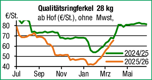 | Ferkel | Am Ferkelmarkt bleibt die Nachfrage fortgesetzt lebhaft, das Angebot konstant auf normalem Niveau. Dennoch überträgt sich die Seitwärtsbewegung bei den Mastschweinen auch auf die Ferkel, so dass in der laufenden Wochen mit stabilen Ferkelpreisen gerechnet werden kann. |