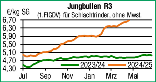 | Schlachtrinder | Das Erzeugerangebot am Schlachtrindermarkt bleibt fortgesetzt in allen Bereichen knapp und selbst in den verkürzten Schlachtwochen können die Bedarfe der Schlachtunternehmen nicht immer gedeckt werden. Trotz zunehmender Widerstände der Vermarkter bestimmt das knappe Angebot die Preisentwicklung, die Notierungen erreichen in allen Kategorien und Handelsklassen neue Höchstmarken. |