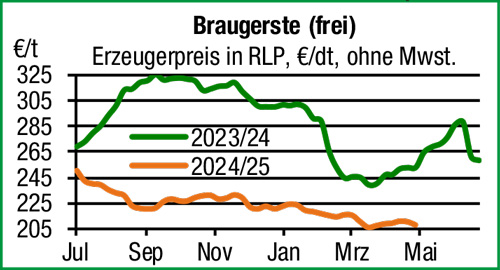 | Getreide und Ölsaaten | Am Getreidemarkt bleiben die regionalen Erzeugerpreise unter Druck. Alterntige Ware gilt vielfach als durchgehandelt. Nachfrage kommt nur für kleinere Einheiten aus der Futterindustrie, Mühlen zeigen kaum Anschlussbedarf. Aufgelder zu Futtergetreide werden reduziert, vereinzelt sind gar Abwehrpositionen spürbar. Bei laufender Frühjahrsbestellung und Futterernte bleibt die Vermarktung der neuen Ernte vernachlässigt, auch weil die Offerten aktuell kaum Handlungsbedarf erkennen lassen. |