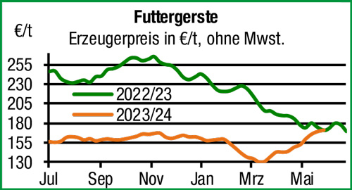 | Getreide und Ölsaaten | Am Getreidemarkt liegt der Fokus bereits deutlich auf der neuen Ernte. Alterntige Ware wird im Handel kaum mehr angedient, auch auf der Abnehmerseite werden kaum mehr Termine vor der Ernte vergeben. Die Preisnennungen des regionalen Erfassungshandels sind zur Vorwoche etwas angezogen, besonders Nacherntetermine können zur Vorwoche zulegen. Das Wochenende hat mit einstelligen Niederschlagsmengen noch nicht die erhoffte Wetteränderung gebracht und in den Frühdruschgebieten beginnt die Gerste mit Farbänderungen die nahende Abreife anzudeuten. |