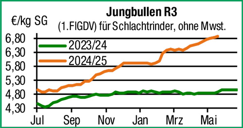 | Schlachtrinder | Die Geschäfte am regionalen Schlachtrindermarkt verlaufen zügig, trotz der extrem hohen Preise lässt sich das begrenzte Erzeugerangebot weiter flott vermarkten. Während für Jungbullen die Preisspitze vorerst erreicht ist, werden weibliche Kategorien nochmals fester bewertet. |