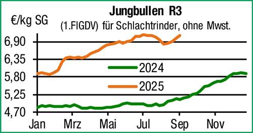 | Schlachtrinder | Die zuletzt wieder befestigten Notierungen haben am regionalen Schlachtrindermarkt zu einem steigendem Jungbullenangebot mit erhöhten Schlachtgewichten geführt. Die Vermarkter zeigen sich aufnahmefähig, die Preise können die feste Basis gut behaupten. Gesucht bleiben aktuell weibliche Kategorien, insbesondere schwere Metzgerfärsen können nochmal deutliche Aufgelder erzielen. |