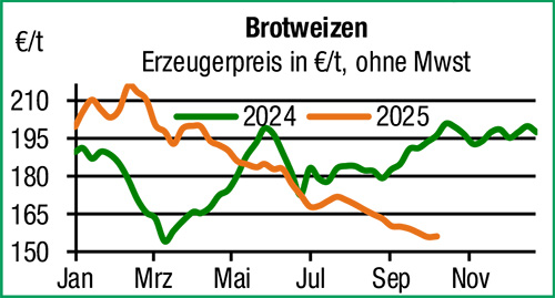 | Getreide und Ölsaaten | Am Getreidemarkt bleibt es beim äußerst ruhigen Geschäft. Die Futterwerke zeigen einen kleinen aber stetigen Bedarf an Futtergerste, weitere Futtergetreide bleiben dagegen vernachlässigt. Aktuelle Braugersten sind weiter ohne Preisnennung, Kontraktpreise für die Ernte 26 können sich nur knapp behaupten. Die Herbstbestellung ist bereits weit fortgeschritten, Körnermaisernte und die Rodung der Zuckerrüben erfolgen vielfach bei grenzwertiger Befahrbarkeit der Flächen. |