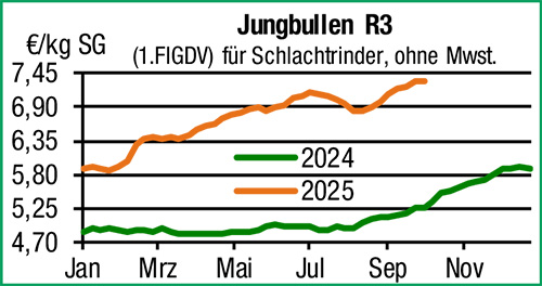 | Schlachtrinder | Trotz leicht steigenden Stückzahlen bleibt der Handel am regionalen Schlachtrindermarkt von reger Nachfrage und flottem Absatzgeschäft bestimmt. Vor allem das Metzgereigeschäft läuft stark und der Bedarf kann nicht immer ausreichend gedeckt werden. Jungbullen und Färsen bleiben weiter fest bewertet, Schlachtkühe auf erreichter Preisbasis gut behauptend. |