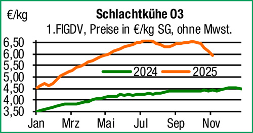 | Schlachtrinder | Das Erzeugerangebot am regionalen Schlachtrindermarkt nimmt weiter zu. In der Folge bauen Schlachtunternehmen und Vermarkter gehörigen Preisdruck auf. Vor allem für weibliche Kategorien in der Zerlegung müssen teils heftige Abschläge in Kauf genommen werden. Auch Jungbullen und Metzgerfärsen können trotz stetiger Nachfrage das hohe Preisniveau der Vorwochen nicht mehr halten. |