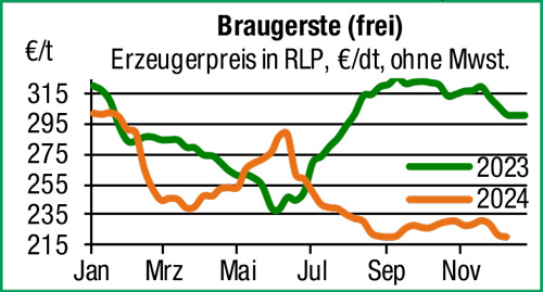 | Getreide und Ölsaaten | Der Getreidehandel wird weiter von der Kontraktabwicklung geprägt. Neue Geschäftsabschlüsse finden kaum statt, das Angebot aus der Landwirtschaft ist sehr gering. Trotz Absenkung der Vorsteuerpauschale liegt der Fokus schon auf dem neuen Jahr. Auch an den Terminmärkten rückt der Februar in Front. Raps kann sich weiter stabilisieren und notiert am Terminmarkt deutlich über der Vorwoche. Entsprechend erholen sich auch die Preise im regionalen Handel. |