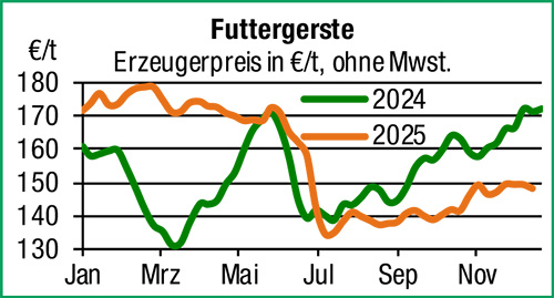 | Getreide und Ölsaaten | Die Vorgaben des Terminmarktes sind schwächer, der regionale Getreidehandel lässt die Erzeugerpreise bei sehr ruhigem Geschäft dennoch unverändert. Zurückgenommen wurden hingegen die Kontraktpreise für die Ernte 26, die bisher schon wenig Abschlüsse zu verzeichnen hatten. Futtergerste mit leichten Verlusten, Braugersten alter Ernte auch zum Jahreswechsel ohne Nachfrage und nur mit einzelnen Preismeldungen. |