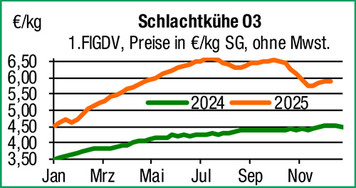 | Schlachtrinder | Der Markt für Schlachtrinder läuft in der letzten vollen Schlachtwoche des Jahres nocheinmal auf Hochtouren. Das Angebot wird vollständig geräumt, die Erzeugerpreise können sich auf breiter Basis behaupten. In einem sehr ausgeglichenen Marktumfeld bleibt es bei vereinzelten Abschlägen um wenige Cent, der Trend bleibt vorerst unverändert. |