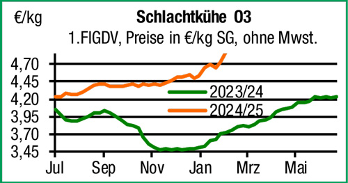 | Schlachtrinder | Die Stückzahlen am regionalen Schlachtrindermarkt bleiben zwar anhaltend niedrig, sind jedoch in weiten Teilen für den begrenzten Bedarf der Vermarkter mehr als ausreichend. In der Folge müssen über alle Kategorien und Handelsklassen weitere Preisabschläge in Kauf genommen werden. |
