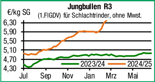 | Nutzkälber | Rekordpreise am Schlachtrindermarkt erhöhen die Einstallbereitschaft in den Mastbetrieben, Nachfrage und Absatz entwickeln sich regional entsprechend flott. Gesucht bleiben bessere, gut mastfähige Qualitäten mit entsprechenden Preisaufschlägen. |