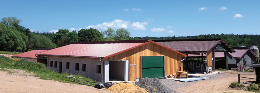 Sven Lorenz hat sich schon während seiner Masterarbeit mit dem bestmöglichen Tierkomfort beschäftigt. Als Ergebnis daraus hat er 2010 für den ersten Bauabschnitt eine mehrhäusige Stallform gewählt. Es wurde eine zweireihige Liegehalle für 69 Kühe mit einem überdachten Futtertisch gebaut. „Für jede Kuh einen Fressplatz“ war für ihn die Maßgabe. Mit der Umstellung des Betriebes auf die biologische Wirtschaftsweise zahlte sich diese Entscheidung aus, denn so konnte problemlos auch die Fütterung mit Frischfutter im Betrieb umgesetzt werden.