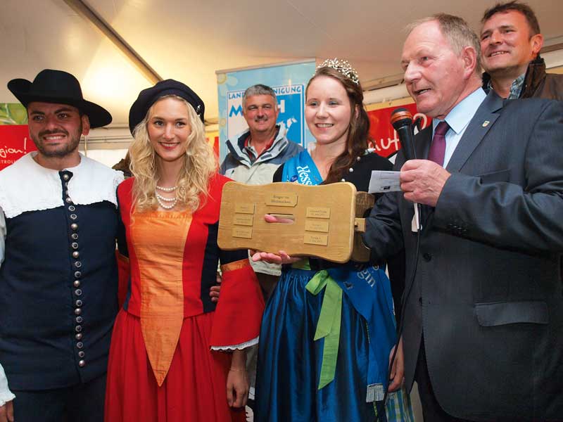 In diesem Jahr ging es ganz knapp zu. Die 24-jährige Landwirtin aus Rodgau verwies den Landesvorsitzenden der Landjugend Lars Döppner auf Rang zwei, der mit 340 Millilitern ein ebenfalls beachtliches Ergebnis ermolken hat. Das Hessentagspaar Janina Till und Cetin Celik erreichten 190 und 240 Milliliter und liegen damit in der Wertung der Hessentagspaare der letzten Jahre ganz vorne. Stolz überreichte Friedhelm Schneider, Vorsitzender der Landesvereinigung Milch Hessen, der Siegerin im Wettmelken die „Trophäe“, die Hessische Milchkönigin Svenja Löw. Sie darf den Goldenen Melkschemel nach dem dritten Sieg in Folge nun behalten. Das Herborner Hessentagspaar Janina Till und Cetin Celik übernahm die Führung in der Wertung der Hessentagspaare der letzten Jahre.