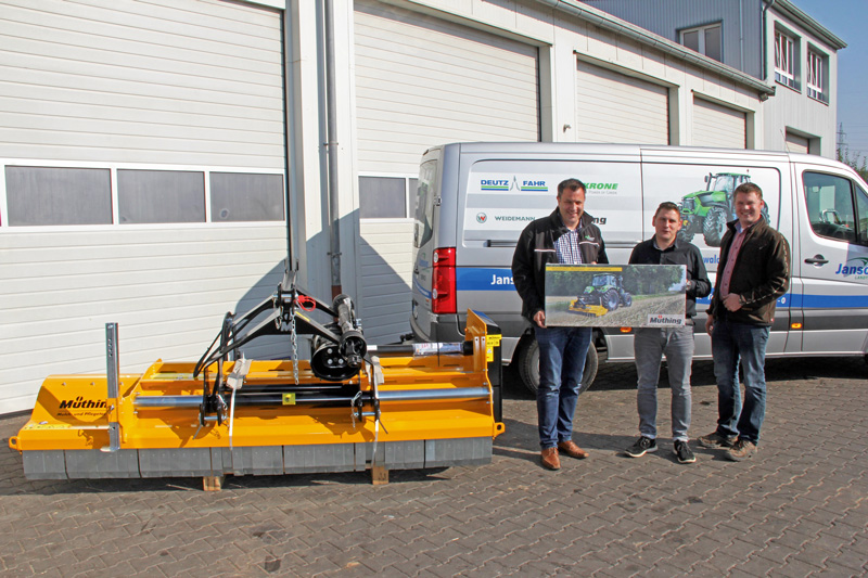 Eine Überraschung gab es am Freitag für Heiko Hesse (M.), GeschäftsÂfühÂrer der Firma Janson Landtechnik in Waldkappel: Christian ZurhaÂke (r.), Produkt-Manager der Firma Müthing und Müthing-VertriebsbeÂaufÂtragter Tim Kurzenknabe (l.), Werksvertretung Kurzenknabe GmbH, lieferten den 100. Mulcher persönlich aus. Denn 100 Mulcher vom Hersteller Müthing hat Heiko Hesse mittlerweile verkauft. Das 100. GeÂÂrät hat eine Maschinengemeinschaft aus Oberdünzebach erworben. „Ich freue mich sehr über den überraschenden Besuch und dass unser Lieferant großen Wert auf den intensiven Kontakt legt“, so Heiko Hesse. Firma Janson Landtechnik ist seit 2009 in Waldkappel tätig. Mittlerweile beschäftigt der Landtechnik-Fachbetrieb 14 MitarÂbeiÂÂter, davon fünf Auszubildende. „Der Berufsnachwuchs ist sehr wichtig, daher bilden wir Fachkräfte selbst aus, die dann übernommen werden sollen“, so Hesse. Firma Janson ist zentraler AnsprechÂpartner in der Region für Kunden aus der Landwirtschaft beim Kauf und Service. Als Geschäftspartner hat man sich für Firma Müthing entÂschieÂden, die Mulcher für Landwirtschaft, Kommunalpflege und für den privaten Gebrauch anbietet, teilte Hesse mit.