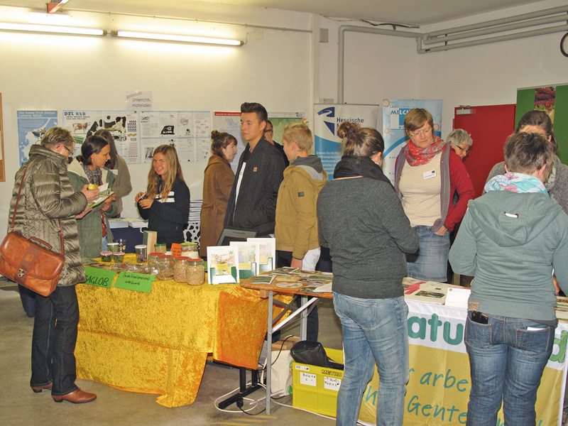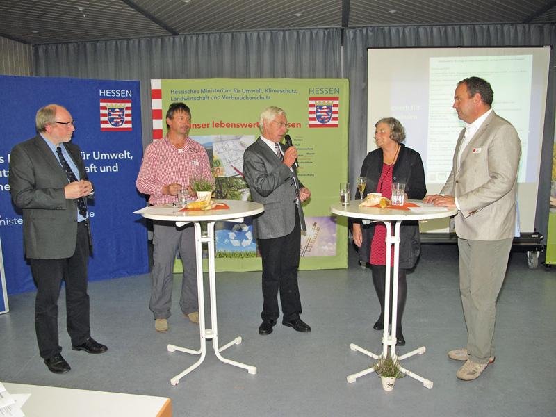 Auf dem Programm standen neben Fachvorträgen und Diskussionsrunden von und mit FachÂexperten auch die Möglichkeiten, sich an Infoständen rund um die Themen Landwirtschaft, Ernährung und Landleben zu informieren und an einer Betriebsführung über den naheliegenden Weidenhof teilzunehmen. In einer ersten Talkrunde, moderiert von Prof. Hermann Schlagheck, nutzten Oberstufenschüler des Lichtenberg-Oberstufengymnasiums aus Bruchköbel die Gelegenheit, Fachfragen zu den Themen Nachhaltigkeit, Biogas, Subventionen, dem Verhältnis Nutzung von Ackerland zu nachhaltiger Fleischproduktion und niedrige Preise für landwirtschaftliche Erzeugnisse an die Experten (siehe Bild oben links) zu stellen. „Unsere Kulturlandschaft ist geprägt durch kleinräumige Strukturen und mehr Grünland als in anderen Regionen“, sagte Staatssekretärin Dr. Beatrix Tappeser. Entsprechend müsse man beim Nachhaltigkeitsgedanken immer die natürlichen Gegebenheiten mit einbeziehen.