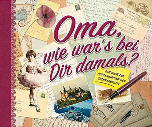 Dieses großformatige Buch bietet auf rund 130 Seiten Platz, damit Oma ihre Erinnerungen darin aufschreibt – von der Kindheit bis zur Gegenwart. Es werden Fragen zur Verwandtschaft, zum Werdegang, zur Schulzeit, zu Hobbys, zu schönen Erinnerungen aus dem Leben und vielem mehr gestellt. Auch die Frage, was früher besser als heute war, taucht auf. Neben den Zeilen für Antworten können Fotos und andere Erinnerungsstücke eingeklebt werden.