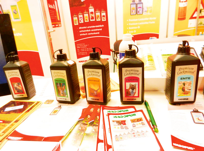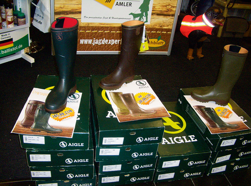 Für Treibjagden sind nicht nur warme, sondern auch stabile Stiefel mit guter Sohle wichtig. Der Spezialanbieter Aigle hat bequeme Stiefel im Angebot (Mitte, rechts), in denen es sich an langen Jagdtagen bequem und mit warmen Füßen gut laufen lässt (circa 165 Euro). Um Wild mit attraktiven Duftnoten vor Flinte und Büchse zu bekommen, warb Hagopur aus Landsberg für Lockmittel (Mitte, links). VW stellte den Pickup-Geländewagen „Amarok“ (unten) in der Jagdedition vor, ausgerüstet mit Rohrbügel, Winde, Hundebox und Aluminum-Rampe (Preis: knapp 40 000 Euro).