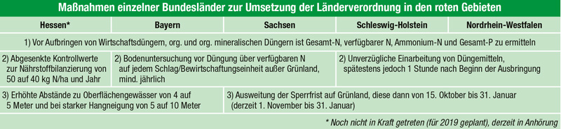 Die Abbildung zeigt die Maßnahmen der bisher in Kraft getretenen Länderverordnungen im Vergleich. Dabei ist die Verpflichtung, den Gehalt von Gesamt-N, verfügbarem N, Ammonium-N und Gesamt-P vor dem Aufbringen von Wirtschaftsdüngern, organischen und organisch-mineralischen Düngemitteln zu ermitteln, in allen aufgeführten Ländern gleich.Bei der Umsetzung der Maßnahmen trifft es die landwirtschaftlichen Betriebe unterschiedlich, so liegen nicht alle Flächen an Gewässern, wo höhere Abstandsauflagen gelten. Die Ausweitung der Sperrfristen betrifft vor allem viehhaltende Betriebe, da häufig Lagerraum fehlt. Verpflichtende Bodenuntersuchungen sind in Sonderkulturregionen mit kleinräumiger Einteilung und mehreren Kulturen im Jahr auf einer Fläche schwer umzusetzen.
