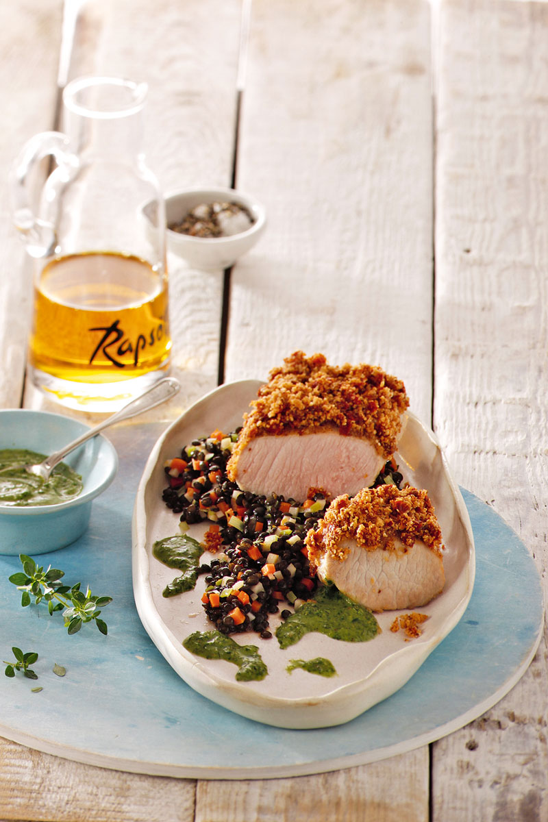 Apfel schälen, vierteln und in Scheiben schneiden. Zwiebel abziehen und in Streifen schneiden. Wacholderbeeren mit dem Messerrücken andrücken. Als Gewürzsäckchen einen Kaffee- oder Teepapierfilter mit Wacholderbeeren, Lorbeerblättern, Pimentkörnern füllen und mit Küchengarn verschließen. Sauerkraut: Speiseöl in einem großen Topf erhitzen. Apfelscheiben, Zwiebelstreifen und Ahornsirup dazugeben, leicht karamellisieren. Sauerkraut und Tomatenmark dazugeben, unter Rühren kurz andünsten. Apfelsaft, Brühe, Chiliflocken und Gewürzsäckchen und das Stück Kasseler hinzufügen und bei schwacher Hitze etwa 45 Minuten mit Deckel dünsten. Das Sauerkraut eventuell mit Salz abschmecken und das Gewürzsäckchen entfernen. Kartoffelstampf: Kartoffeln schälen, in Stücke schneiden und in einen Topf geben. 2 Teelöffel Salz hinzugeben, mit Wasser knapp bedecken und zum Kochen bringen. Kartoffeln mit Deckel in etwa 25 Minuten bei mittlerer Hitze gar kochen. Dann abgießen, sofort durch die Kartoffelpresse geben oder mit einem Kartoffelstampfer zerdrücken. Milch erhitzen. Milch, Crème fraîche und Butter mit einem Schneebesen oder Kochlöffel nach und nach unter die Kartoffelmasse rühren (je nach Beschaffenheit der Kartoffeln kann die Milchmenge etwas variieren). Das Püree bei schwacher Hitze so lange mit dem Schneebesen rühren, bis eine einheitlich lockere Masse entsteht. Mit Salz und Muskatnuss abschmecken. Wichtig: Die Kartoffeln nicht mit einem Mix- oder Pürierstab pürieren, der Brei wird sonst zäh. Sauerkraut, Kartoffelstampf und Kasselerscheiben anrichten. Mit einem Klecks Crème fraîche und nach Belieben einem Thymianzweig garnieren.