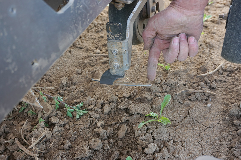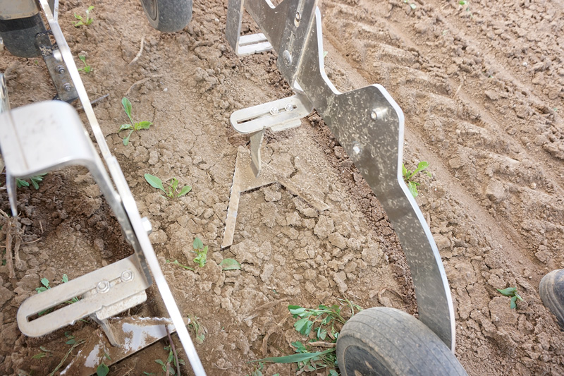 Schwierigkeiten vor allem beim Hackeinsatz – der Farmdroid übernimmt nämlich auch die Aussaat der Rüben – hatten zuvor oft zu Störungen und einem Stopp der Arbeiten geführt, beispielsweise, wenn sich ausgerissene Unkräuter oder Erntereste vor den Arbeitsorganen anhäuften. „Vom dänischen Hersteller wurde die Maschine kontinuierlich verbessert, einige Vorschläge der Praktiker wurden angenommen. Ich habe unter anderem eigene Schare entwickelt und schweißen lassen, aus Dänemark erfolgten stetig Updates der Software, um das System immer besser an die Bedingungen im Feld anzupassen“, so Kranz.
