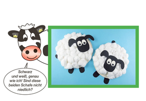 4. Der Kopf wird anschließend auf die Watte geklebt. Die Füße und der Schwanz werden von der Rückseite her mit Kleber befestigt.