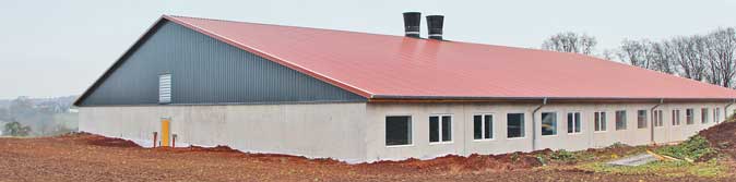Wesentliche Vorteile dieser Rohbaulösung sind die relativ schnellen Bauzeiten sowie glatte Oberflächen, die eine leichte Reinigung ermöglichen. Als Stalldecke wurde ein Aluprofilblech mit einer Zelluloseschüttung eingebaut. Die Reinigung der glatten Stalldecke ermöglicht ebenfalls einen hohen Hygienestandard im Stall. Die aufgebrachte Schüttung soll nicht nur Wärmedämmung im Winter sein, sondern auch ein unnötiges Aufheizen im Sommer minimieren. Der Doppelkammstall für 126 Produktivsauen verfügt über zwei Abferkelabteile mit jeweils 18 Abferkelbuchten. Ein Reserveabferkelabteil mit sechs Buchten vervollständigt den Abferkelbereich. Als Besamungs- und Warteabteile sind sechs Abteile mit jeweils 20 Selbstfangfressliegebuchten errichtet worden. In einem separaten Abteil sind die Bestandseber sowie die Jungsauen untergebracht. Im Wartestall werden die Zuchtsauen in stabilen Gruppen gefüttert. Um die Tiere in Ruhe fressen zu lassen, wurde als Haltungssystem ein Selbstfangbesamungsstand eingebaut. Die Ferkelaufzucht erfolgt in drei Abteilen mit je 200 Plätzen. Der Futter- und Hygienebereich vervollständigt die Stallanlage.