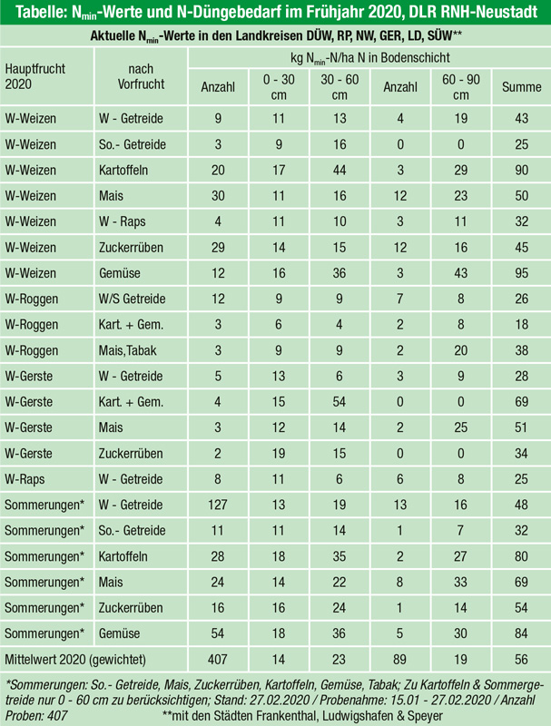 Zur Feststellung der Nmin-Gehalte wurden im Zeitraum 15. Januar bis 26. Februar 2020 auf repräsentativen Ackerflächen Bodenproben gezogen und auf ihre Gehalte an pflanzenverfügbarem N untersucht. Die Proben stammten in der Regel aus den Bodenhorizonten 0 bis 30 cm und 30 bis 60 cm. Nur ein kleinerer Anteil dieser Proben auch aus der Schicht 60 bis 90 cm.