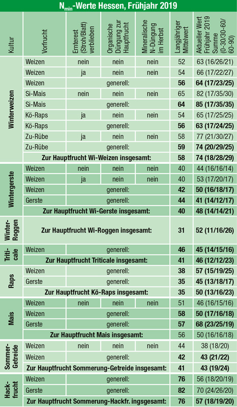 In der Tabelle werden die langjährigen Nmin-Werte den aktuellen Werten gegenübergestellt. Hierbei werden Gruppierungen der jeweiligen aktuellen Hauptfrüchte nach Vorfrucht, dem Verbleib deren Erntereste, sowie einer stattgefundenen organischen und mineralischen N-Düngung vorgenommen. In jeder aufgelisteten Gruppierung liegen im Frühjahr 2019 mindestens 15 Einzelwerte zugrunde. Diese vom LLH zur Verfügung gestellten Mittelwerte können zur Erstellung der Düngebedarfsermittlung herangezogen werden, sofern keine eigenen Nmin-Werte vorliegen. Zukünftige Aktualisierungen der Werte sind auf der Internetseite des LLH (www.llh.hessen.de) zu finden.