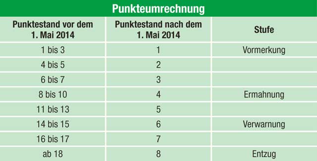 Allerdings werden zum 1. Mai 2014 nur diejenigen Punkte umgerechnet und übertragen, die nach dem neuen Recht eintragungsfähig sind. Nicht nach neuem Recht eintragungsfähige Punkte werden „abgespeckt“, so zum Beispiel Verstöße gegen eine Umweltzone, Sonntagsfahrverbot oder Kennzeichenmissbrauch.