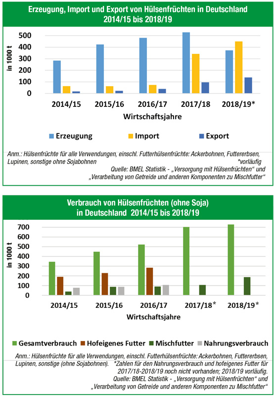 Die heimische Erzeugung von Hülsenfrüchten ist in den letzten Jahren bis zum Wirtschaftsjahr 2017/2018 auf rund 530 000 Tonnen kontinuierlich angestiegen. Mit der Trockenheit 2018 sank die Erzeugung in Deutschland mit einer Erntemenge von 380 000 t deutlich gegenüber den Vorjahren. Eine steigende Nachfrage lässt sich am Import von Hülsenfrüchten erkennen: Von 2016/17 auf 2017/18 hat sich die Einfuhr verfünffacht und ist auch zum Jahr 2018/19 nochmals um 30 Prozent angestiegen. Um die Lücke zwischen Verbrauch und Erzeugung zu schließen wurden im Wirtschaftsjahr 2018/2019 450 000 t Hülsenfrüchte aus dem Baltikum, Polen, der Ukraine und Russland importiert.