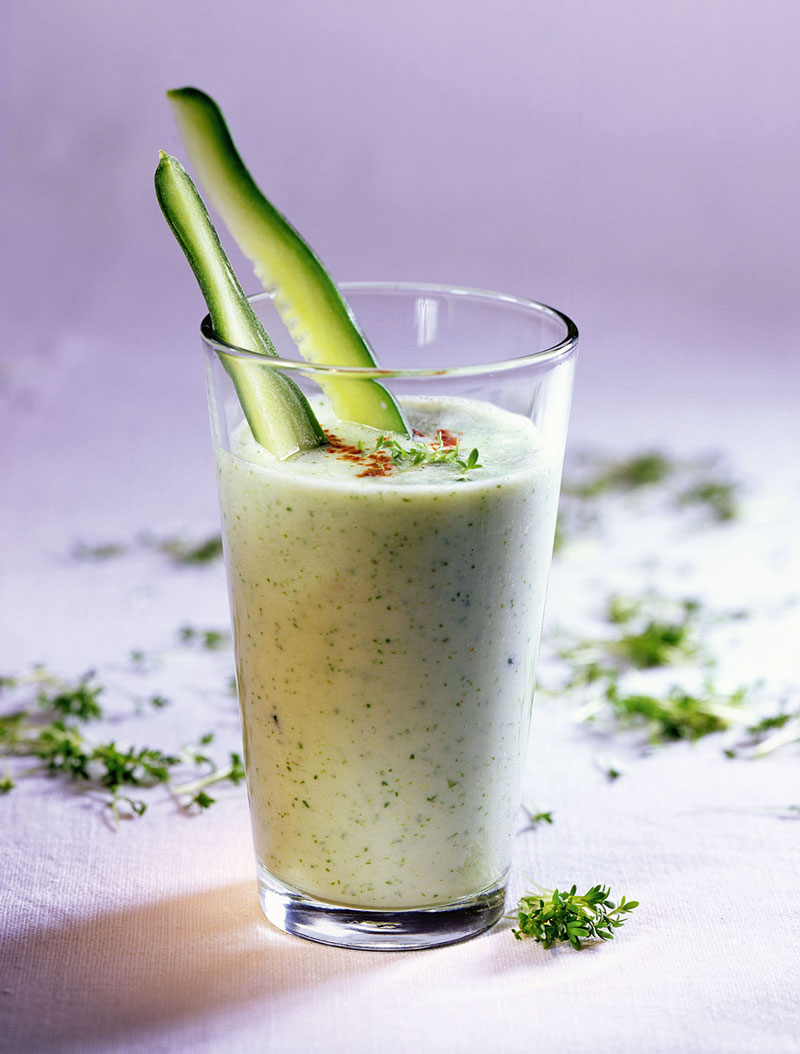 Gurken schälen und grob zerkleinern. Kresse mit der Schere abschneiden. Buttermilch mit den Gurkenstücken und der Hälfte der Kresse im Mixer pürieren. Mit Kräutersalz würzen. In Gläser mit großem Durchmesser gießen und mit Gurkensticks, Kresse und Cayennepfeffer servieren. Pro Portion: 59 kcal, 5 g Eiweiß, 1 g Fett, 8 g KohlenhyÂdrate.