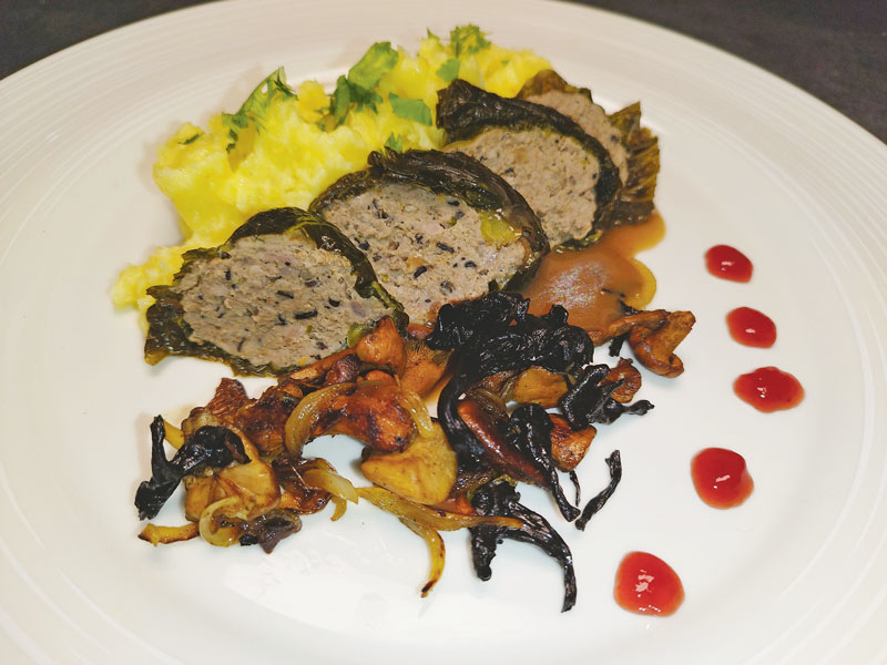 Wirsingblätter ablösen, waschen und in Salzwasser circa 5 Minuten blanchieren. Zum Abtropfen auf ein trockenes Geschirrtuch legen und abkühlen lassen. Das Fleisch, 2/3 der Pilze mit Knoblauch und Zwiebeln wolfen und mit Salz und Pfeffer würzen. Vor dem Mengen der Masse das Ei zu geben. Wenn alles gut miteinander vermengt ist, kleine Portionen nehmen und in die Wirsingblätter einrollen und mit einem Spieß oder Bindfaden verschließen. Die Krautwickel im Bräter mit Butterschmalz anschmoren und mit Wildfond ablöschen. Dann mit dem Wasser vom Blanchieren auffüllen, bis alle Krautwickel bedeckt sind. Nun bei schwacher Hitze langsam köcheln lassen. Je nach Größe der Krautwickel beträgt die Garzeit circa 15 Minuten. In einer Pfanne die restlichen Pilze mit Butterschmalz anschmoren und den Kartoffelstampf vorbereiten. Die Krautwickel aus dem Bräter nehmen und die Soße, bis zu gewünschten Konsistenz, reduzieren und nach Belieben mit Salz und Pfeffer würzen. Die Krautwickel mit Kartoffelstampf und geschmorten Pilzen anrichten und mit etwas Zwetschgengelee dekorieren.