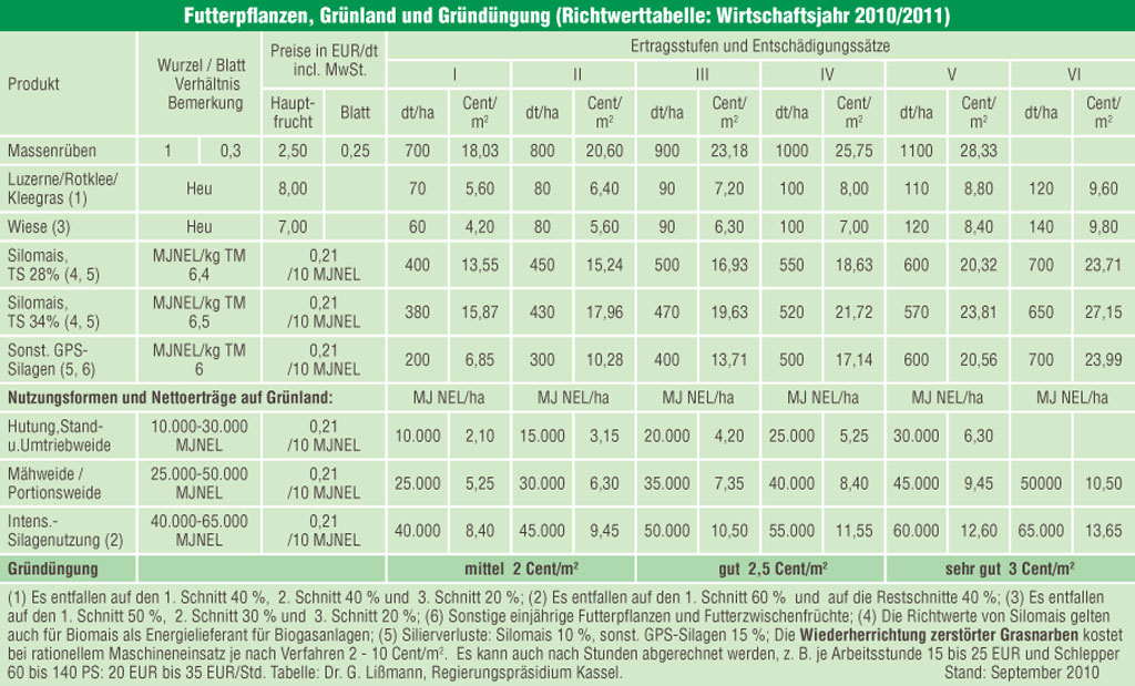 Die Richtwerte gelten für eine mittlere Schadenstiefe von 5 bis 10 cm und für eine mittlere Schadensdichte. Als Reparaturfläche wird die gesamte mit der Maschine zu überfahrende Fläche gerechnet. Entscheidend für Aufwand und Kosten der Reparatur ist jedoch letztlich die Schadensausprägung insgesamt. So können je nach Intensität des Schadens, wie bei vereinÂzelten flachen Aufbrüchen oder Stippen noch entsprechende Abschläge von den Richtwerten vorgenommen werden. Bei tiefen flächigen Schäden sind dagegen entsprechende Aufschläge zu den Richtwerten vorzunehmen. Die Werte beziehen sich nur auf die Wiederherstellungskosten. Die Kalkulation des Aufwuchsschadens ist der zweite Bestandteil der Schadensersatzberechnung und kann aus den RichtÂwerten in Tabelle „Futterpflanzen“ abgeleitet werden.