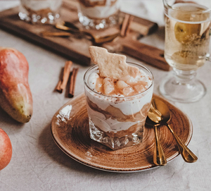 3 große Birnen schälen, entkernen und in Würfel schneiden. Mit 50 g Zucker, 1 Stange Zimt, dem Saft einer Zitrone und 200 ml Freixenet Mederaño Glühwein Weiß aufkochen und bei kleiner Flamme für circa 5 Minuten köcheln. Die Birnen dürfen weich werden, sollten aber nicht zerfallen. Für die besondere kräutrige Note einen Zweig Rosmarin ins Kompott geben. Sollten die Birnen sehr saftig sein, kann das Kompott mit einem Teelöffel Speisestärke abgebunden werden. Dazu einige Löffel der Flüssigkeit mit Speisestärke anrühren, in den Topf geben und kurz aufkochen lassen. Anschließend abkühlen und gut durchziehen lassen. Für die Quarkmasse wird zunächst Sahne steif geschlagen. Anschließend mit Quark, Schmand, etwas Zitronenabrieb, Puderzucker und einer ausgekratzten Vanilleschote verrühren. Dann wird die Sahne unter die Quarkmasse gehoben. Anschließend alles in Gläser schichten. Je nachdem wie groß diese sind, ergibt das Rezept vier bis sechs Gläser. Verziert werden darf nach Herzenslust, zum Beispiel mit Schokoraspeln oder Weihnachtsplätzchen. Dazu passt ein Glas heißer Glühwein in Weiß perfekt.