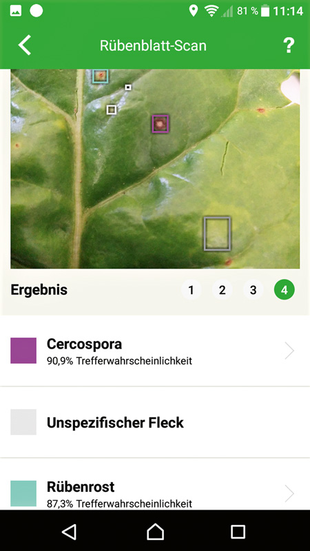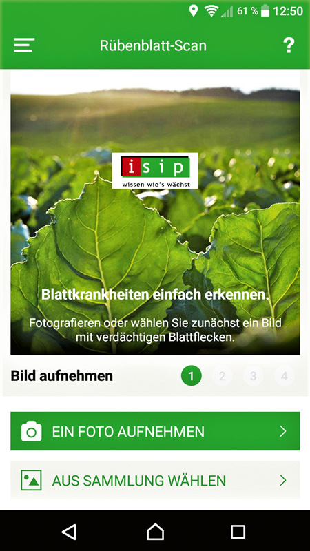 Die Bedienung der App ist sehr einfach gehalten und es sind nur vier Schritte nötig, um die einzelnen Blattkrankheiten diagnostizieren zu können. Aktuell werden folgende Blattflecken erkannt: Cercospora, Rübenrost, Ramularia, Phoma, Pseudomonas und unspezifische Blattflecken (Löcher oder Verschmutzungen am Blatt). Um eine vollständige Diagnose durchführen zu können, ist eine aktive Internetverbindung nötig. Wenn diese Voraussetzung erfüllt ist, kann es sofort losgehen.