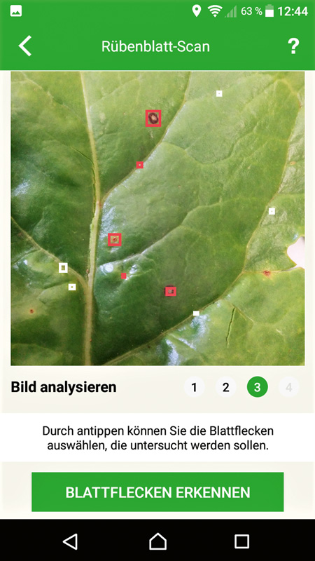 Wenn viele Blattflecken gefunden werden, kann der Anwender im dritten Schritt neben der automatischen Auswahl auch selbst noch mal bestimmen, welche Blattflecken genau untersucht werden sollen. Die befallsverdächtigen Zonen werden von der App ausgeschnitten und an einen Internet-Server geschickt. Dies ist nötig, da die genaue Identifikation der Blattflecken sehr große Rechenkapazitäten erfordert, die auf den heute handelsüblichen Smartphones noch nicht zur Verfügung stehen. Nach wenigen Sekunden Rechenzeit schickt der Server dann die Antwort und die Krankheiten, die gefunden wurden, werden angezeigt.
